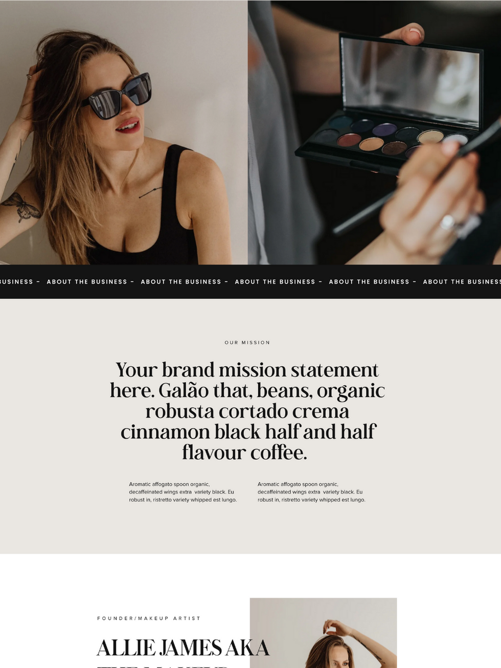Elevate your online presence with the Allie James Wix website template designed specifically for service-based businesses such as makeup artists, lash artists, hair stylists, and beauty professionals. With a neutral color scheme accented by dark tones and a bold pop of textual color, this template is designed to showcase your services and portfolio in a professional and visually-stunning way so you can attract potential clients and set yourself apart from the competition!